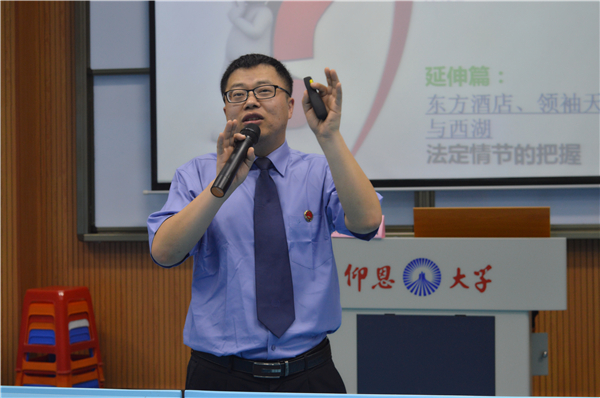 活动分为两个议程。一是聘书颁发仪式,由王晓丽隆重介绍了陈树斌检察官,并代表英国beat365官方网站聘请陈检察官为兼职副教授。二是由陈检察官对英国beat365官方网站14至16级学生进行授课。