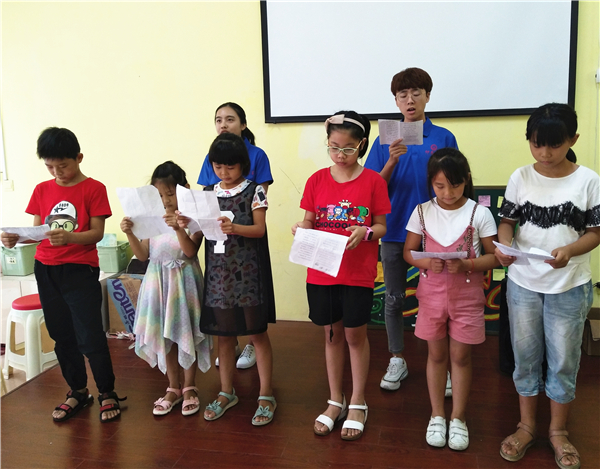 活动过程中,实践队员根据表演计划,将孩子们分为“感恩歌曲演唱”,“梦想诗歌朗诵”和“诚信情景剧”三个小组,分开进行节目排练。在队员和小朋友的共同努力下,节目排练进展顺利,孩子们了解了表演流程,对节目内容的演绎也更加得心应手,为他们即将展现的精彩汇报演出增添实力与信心。