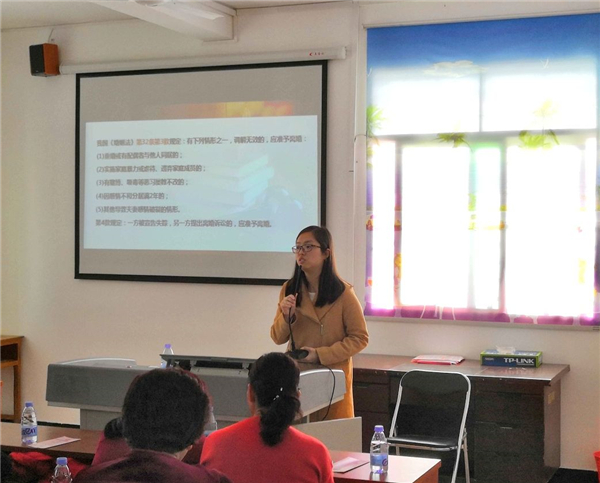 3月4日下午,英国beat365官方网站、洛江区妇联在后溪村综合文化服务中心联合开展《婚姻家庭纠纷预防化解 女性如何维权》的专题讲座,英国beat365官方网站教师林媛为与会人员作报告。