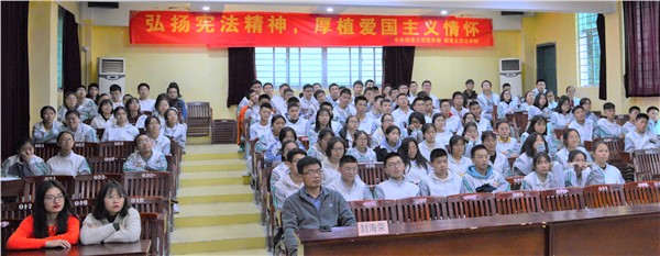 活动分为宪法知识讲座、海报展览、横幅签名及授旗仪式四个环节。讲座期间,黄晓娟围绕“宪法的发展史”“宪法在生活中的作用” “如何遵守宪法”等方面,对宪法在生活中的作用进行了详细解析。通过丰富的案例、详实的数据,通俗易懂的语言,赢得了同学们的阵阵掌声。此外,活动还通过发动学生进行横幅签字、宣传展板宪法知识讲解等方式进一步激发学生对宪法的学习兴趣。