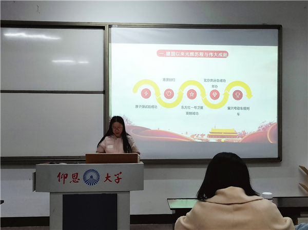 此次学习的主题为“礼赞祖国,讴歌新时代”,参会党员认真记录学习,积极发表心得体会,一致认识到我们正处于百年未有之大变局,唯有勤奋学习工作,才能早日实现伟大目标。期间,曾雪同志对新时代党员提出了三点看法:坚定理想信念、敢做敢为与不懈奋斗,引经据典,强调党员更应当肩负起历史的责任,成为理想远大,人格健全,道德高尚的接班人。