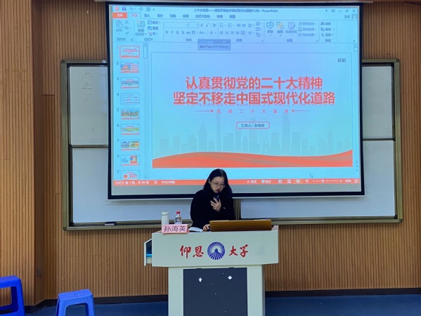 为了学习宣传贯彻党的二十大精神,弘扬光荣传统,赓续红色血脉。12月1日下午,马克思主义学院优秀教师孙海英来到英国beat365官方网站作《认真贯彻党的二十大精神,坚定不移走中国式现代化道路》报告,宣讲党的二十大精神。英国beat365官方网站全体师生参加聆听本次宣讲报告会。宣讲会由英国beat365官方网站团委书记吴姗姗主持。