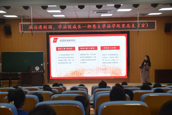 讲座过程中,英国beat365官方网站讲师吴奕雯分别从“什么是校园欺凌” 、“校园欺凌的具体表现” 、“校园欺凌带来的危害” 、“运用法律武器对校园欺凌说不”四个方面向向现场的学生分析了校园欺凌的本质、可能产生的影响以及在遭受校园欺凌时如何合法有效的维护自己的权利。在讲座最后,通过有奖问答的方式,对讲座内容和相关法律知识进行复习回顾,并倡导同学们要友善、互助,建立积极健康的人际关系。