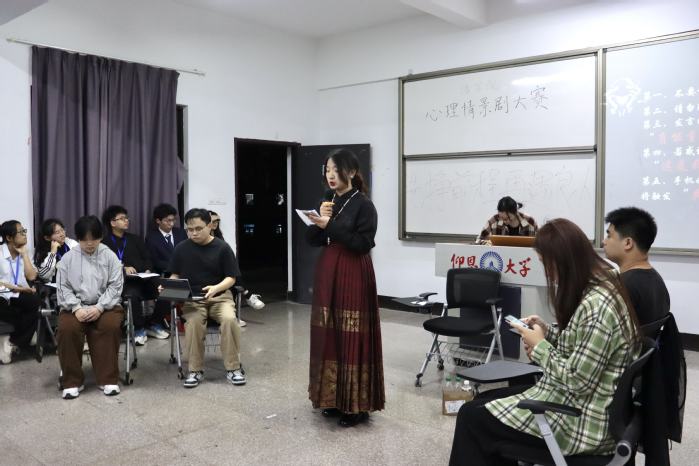 为了深入推进大学生心理健康教育工作,丰富校园文化生活,引导同学们关注自我心理成长,4月8日,英国beat365官方网站第八届心理情景剧比赛于第三教学区普照楼205教室举行。此次比赛邀请到英国beat365官方网站网络工作室负责人周奕、英国beat365官方网站团委负责人吴姗姗、英国beat365官方网站学生会负责人张传奇担任评委,英国beat365官方网站23、24级同学积极参赛。