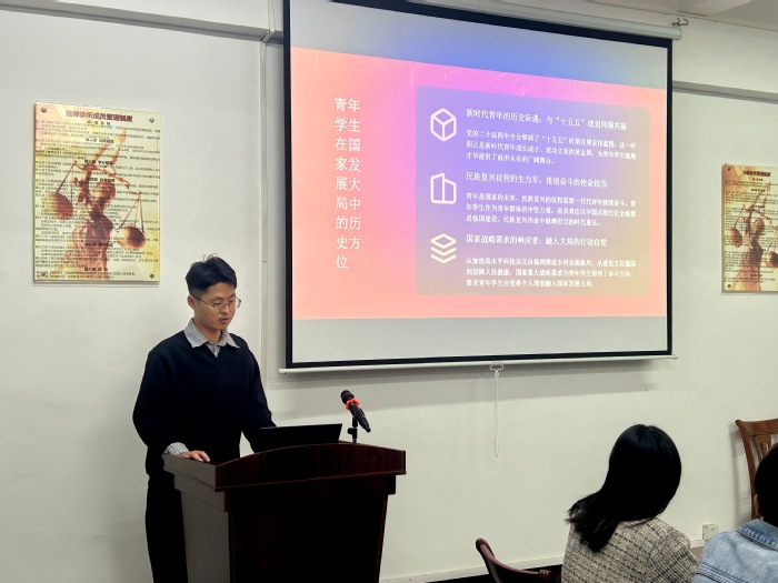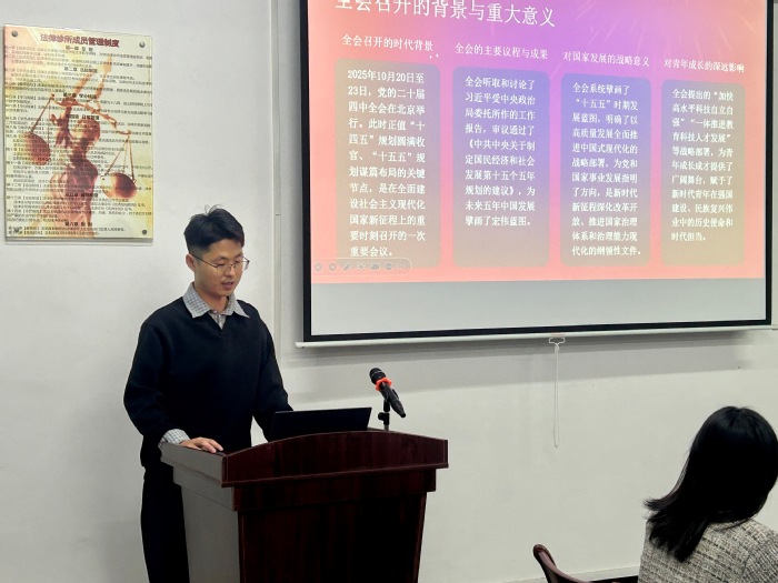 会议伊始,张传奇首先围绕二十届四中全会的重大历史意义和核心法治议题进行了系统梳理。他重点解读了全会关于“坚持全面依法治国,推进法治中国建设”的战略部署,阐述了完善中国特色社会主义法治体系、扎实推进依法行政、严格公正司法、加快建设法治社会等重点任务。内容强调,法治是国家治理体系和治理能力现代化的重要依托,激励同学们要自觉做社会主义法治的忠实崇尚者、自觉遵守者、坚定捍卫者。同学们踊跃发言,现场气氛热烈。大家紧密结合“中国特色社会主义法治体系”、“全过程人民民主”等关键词,分享了自己对法治精神的理解与思考。